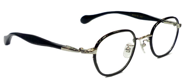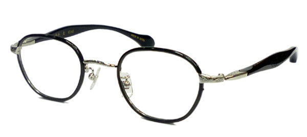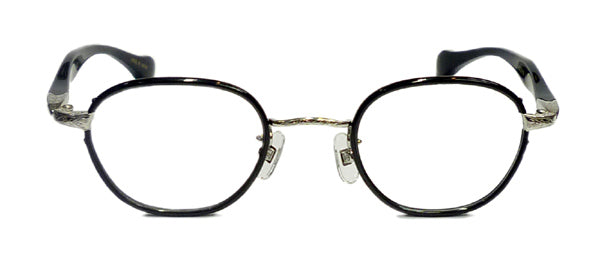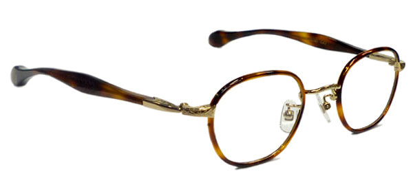 クラシカルなウエリントンタイプのメタルフレームにセル巻き仕様です。テンプルはKS-54タイプを採用しました。 そしてこのモデルの一番のポイントはヨロイが一個智仕様だということです。それも玉型に沿って円弧を描き専門部品のように絞り込んでいます。 この細部にわたるこだわりこそが杉本圭の最大の魅力で有り、まるで60年代のドイツのクラフツマンシップを彷彿とさせるものがあります。