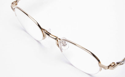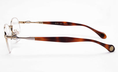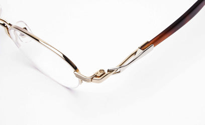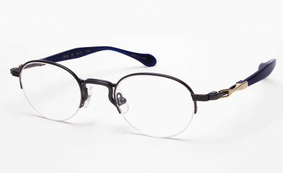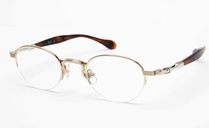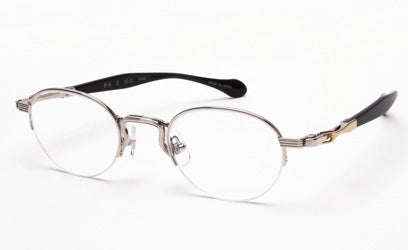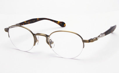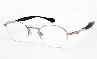 デザインはブリッジ・リム・ヨロイなどをラインで構成しています。そしてテンプルはビンテージフレームなどにも用いられるテンプル長の収縮するデザインモチーフを採用し、セル手としてまとめています。